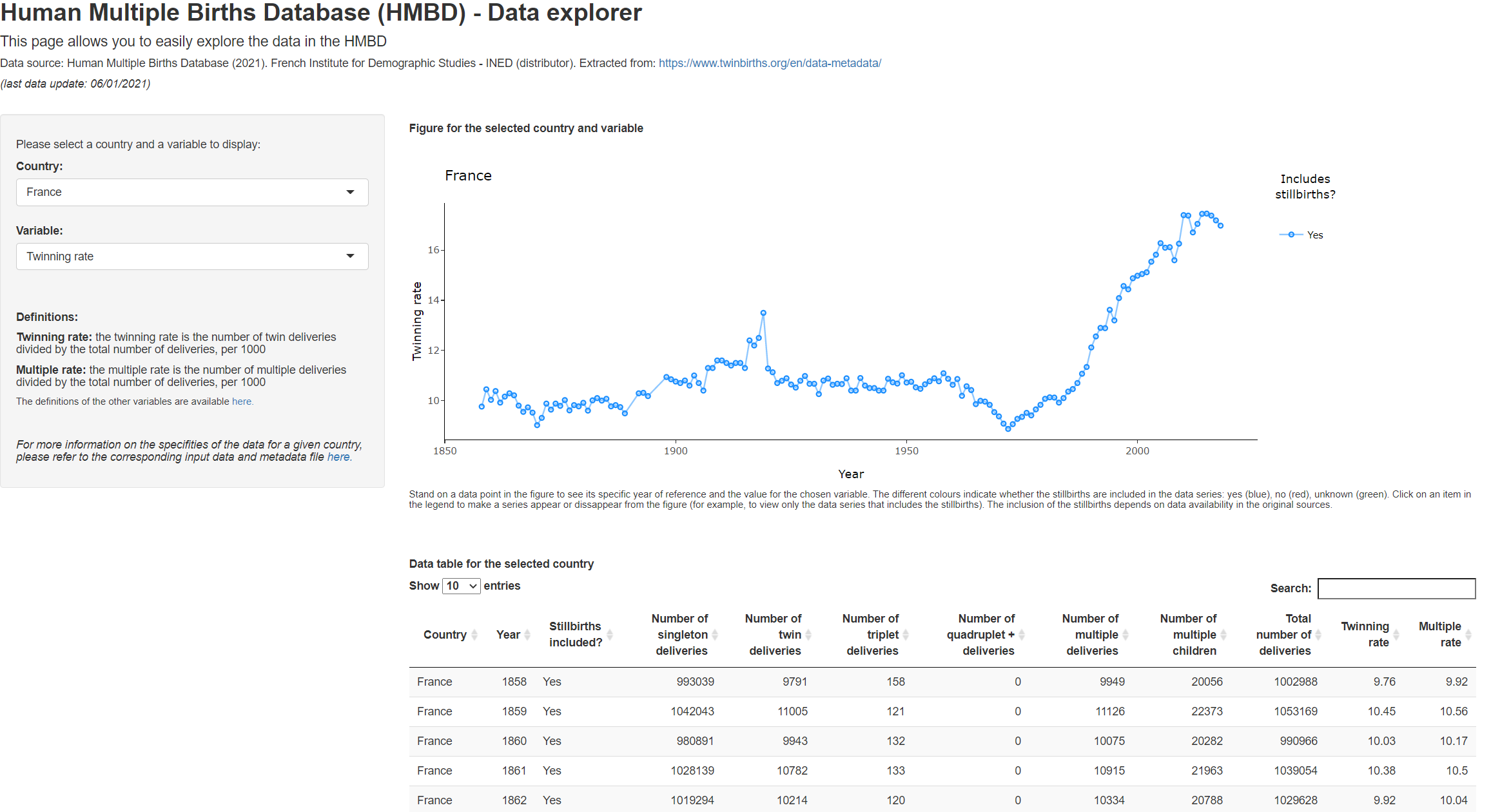 | Twinning_rate | Nombre d’accouchements doubles divisé par le nombre total d’accouchements, pour 1000 accouchements |